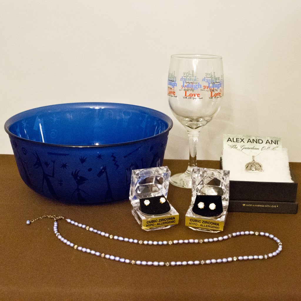 Package includes Boston Museum of Fine Arts azure blue glass bowl with animals etched along the perimeter and poetry etched on the base, a wine glass to “Live, Laugh, Love”, accompanied by necklaces and earrings.