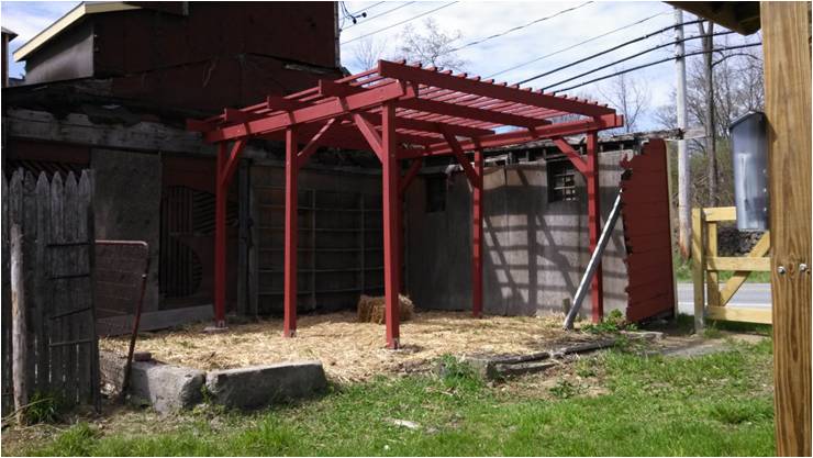 A Boy Scout’s Eagle Scout project dealt with a dilapidated shed on the north end of the Mill. The shed was used to store apples prior to processing into cider. By 2012 the shed was in severe disrepair and so we removed all but the road-side wall and the Boy Scout replaced it with a pergola in the footprint of the old shed.