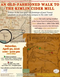 In coordination with the Vassar College Ecological Preserve and The Environmental Cooperative at the Vassar Barns, Cider Mill Friends has organized a walk from Vassar College and Vassar Farms to the Kimlin Cider Mill. Follow in the footsteps of past Vassar students who walked to the Mill to get cider, donuts, cookies, and generally hang out. This is the second year of the event. More details in the flyer below (click to enlarge).
