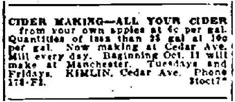 Ralph Kimlin purchased the right-of-way east of the Wappingers Creek in 1920. The earliest (found so far) advertisement in the Poughkeepsie Eagle-News, dated October 9, 1920 (below), shows the Manchester cider mill began operating in the same year.
